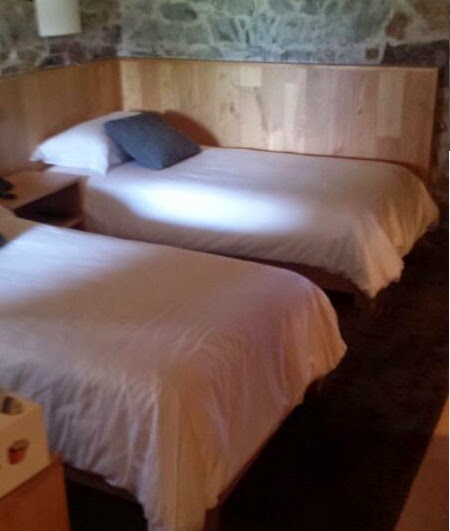cama de matrimonio de 2x2 y un baño privado, decorado en piedra, dotado de una